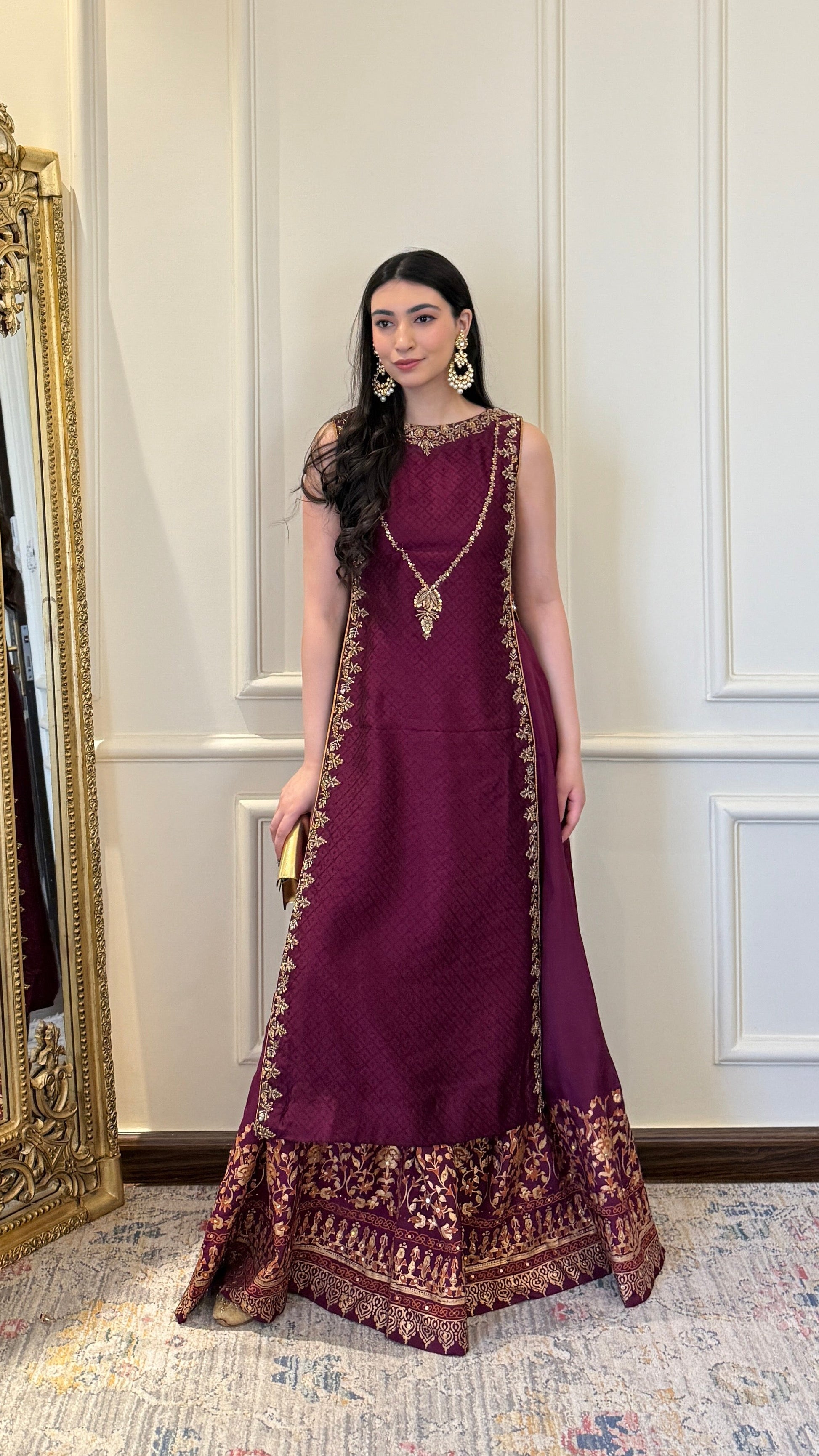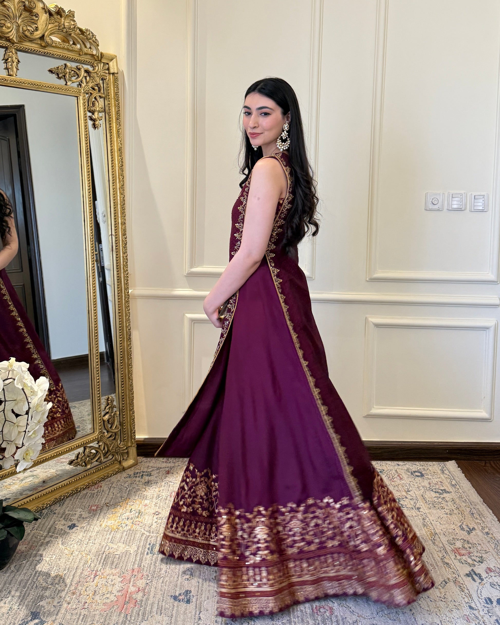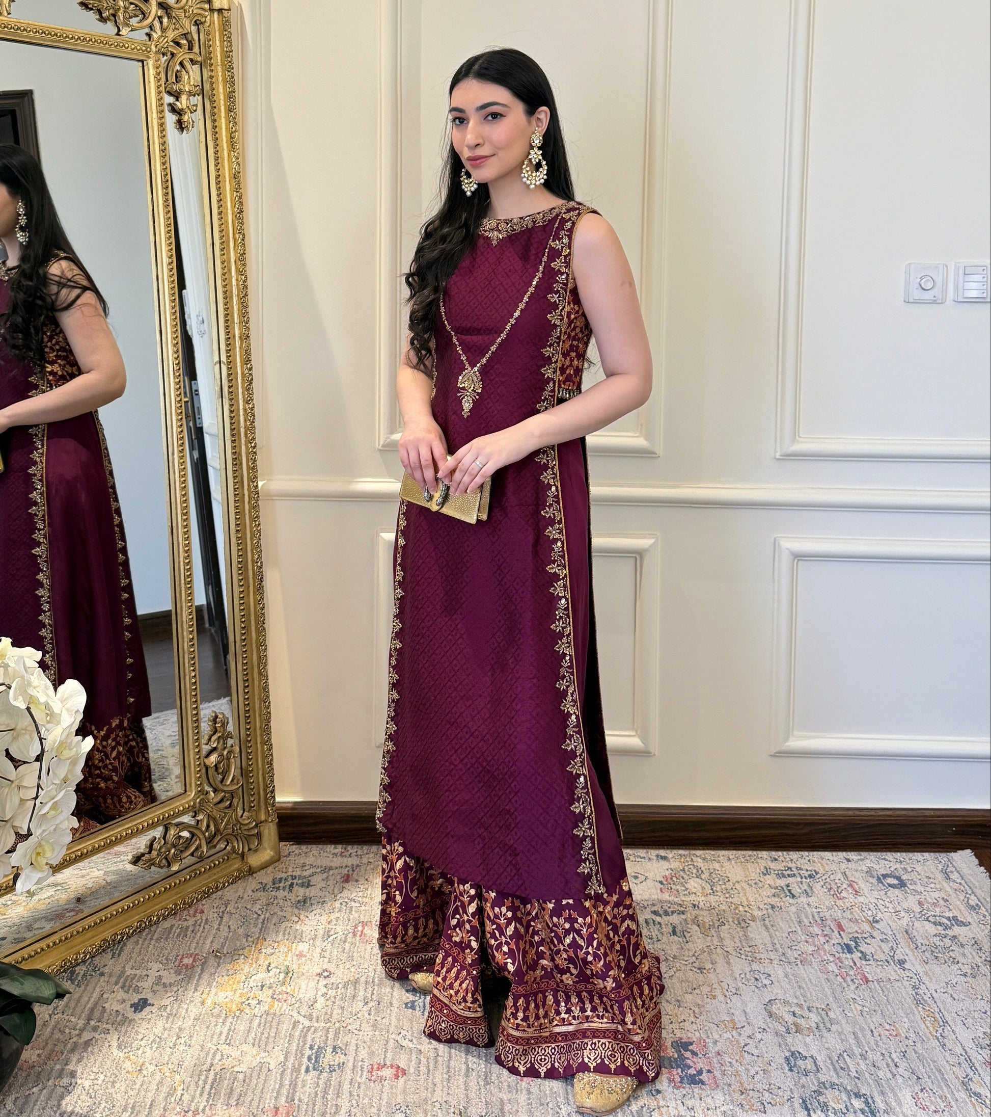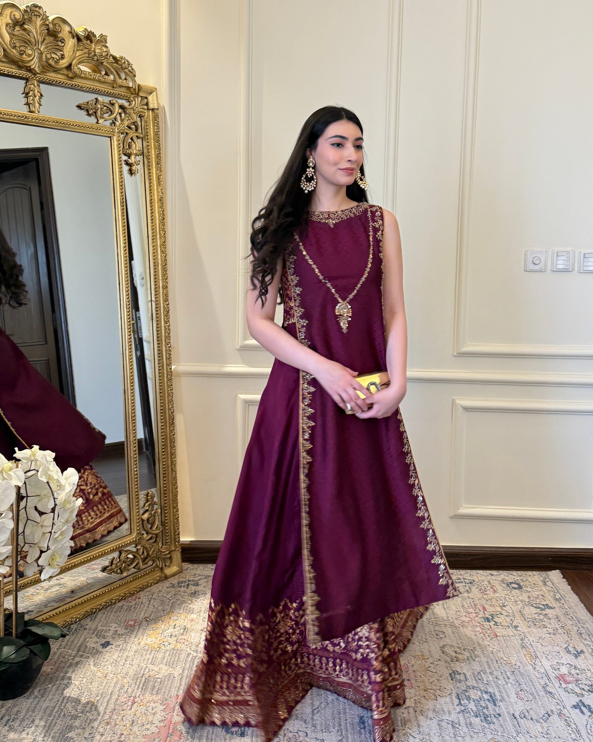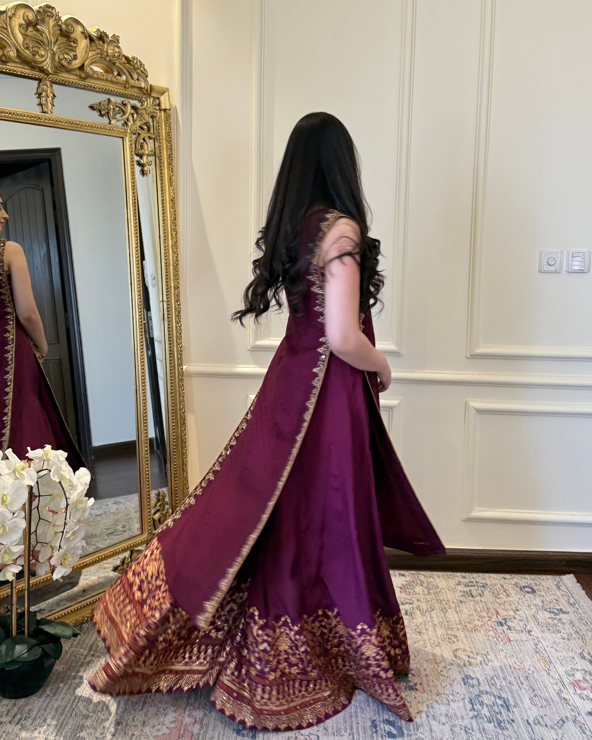 A two panel shirt featuring intricate zardozi handwork on both the front and back, adding a luxurious touch to its deep navy color. The sides of the shirt are adorned with elegant block print and zardozi handwork, enhancing the overall design with a blend of traditional craftsmanship and modern aesthetics. Its flared two-leg bottom adorned with exquisite & traditional block printing and delicate zardozi handwork, this ensemble is a masterpiece of style